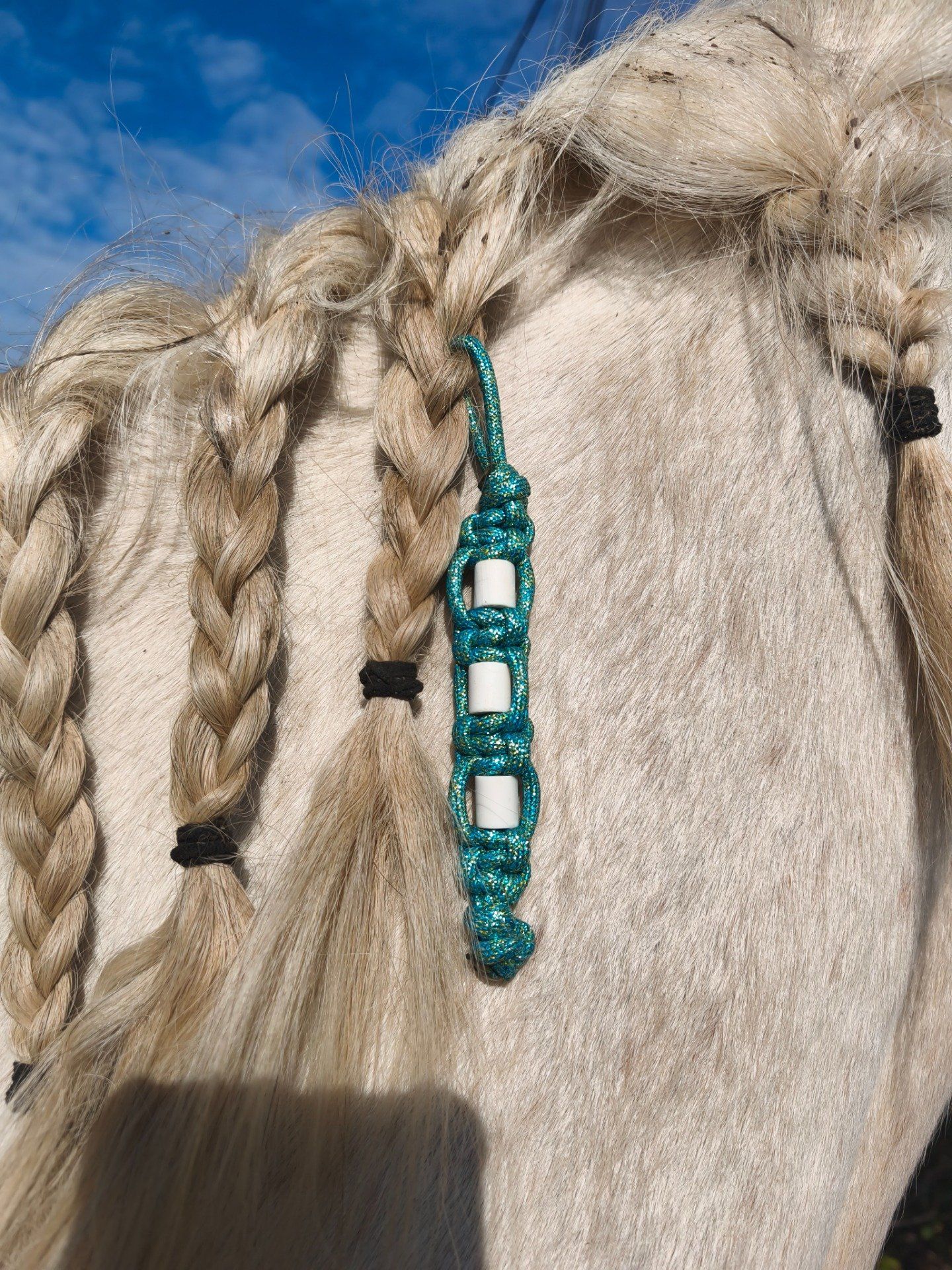 tout simplement dans une tresse bien serrée. Pour plus d’efficacité, on préconise un charm avec plus de perles à attacher dans la queue, mais dans la crinière c’est un bon endroit que les tiques aime particulièrement.